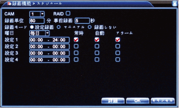 各カメラごとに曜日・時間のスケジュール設定や、事前(プレ)録画の秒数設定が可能です。各カメラごとに4パターンスケジュールが設定できます。モーション録画などの映像の変化での録画(自動録画)や外部センサー機器の検知による録画(アラーム録画)なども設定が可能です。
